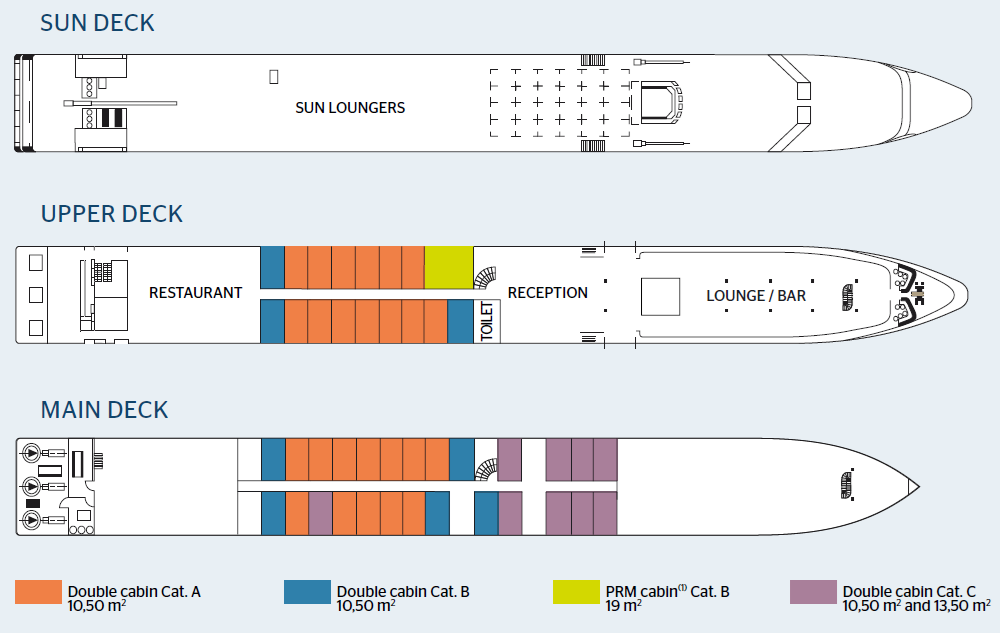 基本配備完善,包括獨立衛浴、空調、電視與收納空間,滿足旅途中所需。床型可依需求調整,搭配平穩航行,提供穩定的睡眠品質。