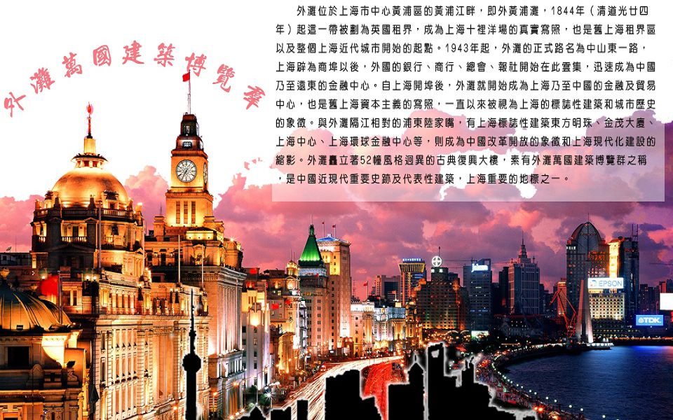 【外灘璀璨夜景】位於上海市中心黃浦區的黃浦江畔,即外黃浦灘,1844年(清道光廿四年)起這一帶被劃為英國租界,成為上海十裡洋場的真實寫照,也是舊上海租界區以及整個上海近代城市開始的起點。外灘全長1.5公里,南起延安東路,北至蘇州河上的外白渡橋,東面即黃浦江,西面是舊上海金融、外貿機構的集中地。外灘矗立著52幢風格迥異的古典復興大樓,素有外灘萬國建築博覽.群之稱,是中國近現代重要史跡及代表性建築,上海重要的地標之一。