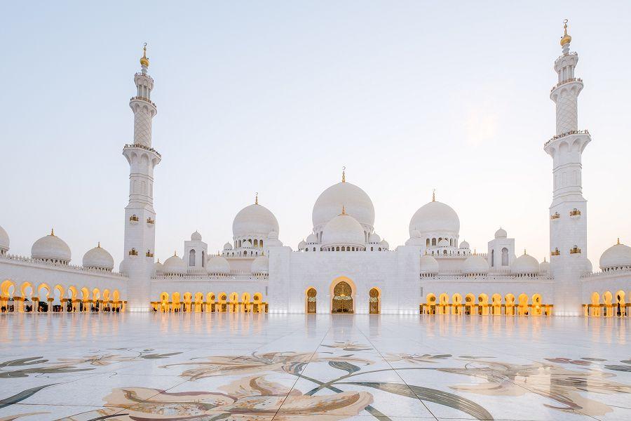 【謝赫扎耶德大清真寺】(入內參觀)是阿拉伯聯合大公國首都阿布達比的一座清真寺,以該國首任總統扎耶德•本•蘇爾坦•阿勒納哈揚命名並在他死後也葬在寺旁。謝赫扎耶德大清真寺的設計和建設可謂團結世界聯合之作,它運用來自印度、義大利、德國、埃及、土耳其、摩洛哥、巴基斯坦、馬來西亞、伊朗、中國、英國、紐西蘭、馬其頓和阿拉伯聯合大公國等國家的藝術工匠和建築材料。選用的天然材料,多是基於其設計及耐久的特性,包括大理石、黃金、半寶石、水晶和陶瓷。它由義大利英培瑞基鏤公司建造。 謝赫扎耶德清真寺的設計受到波斯建築、莫臥兒建築和埃及阿布阿巴斯穆斯林清真寺的亞歷山大清真寺的啟發,也就是印度伊斯蘭的清真寺建築,特別是巴基斯坦拉合爾的巴達沙清真寺的直接影響。大清真寺的圓頂佈局和建築平面圖靈感來自於巴達沙清真寺。它的拱門是典型的摩爾式建築和它的尖塔屬古典阿拉伯建築。