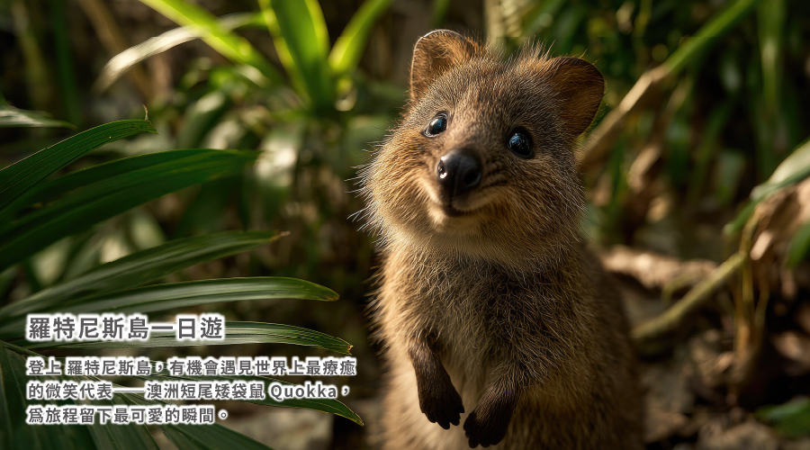 【羅特尼斯島】是伯斯海岸線外的一個印度洋上小島,它擁有細白的海灘與晶瑩透徹的海灣,其適合浮潛及游泳而聞名。選一處細白的沙灘發呆,海天一線的美,令人忘懷,島上悠閒的步調,絕美的景色,都帶你遠離凡人的世界,是當地人度假消磨時光的聖地。