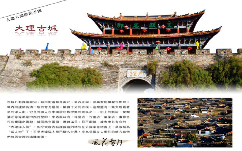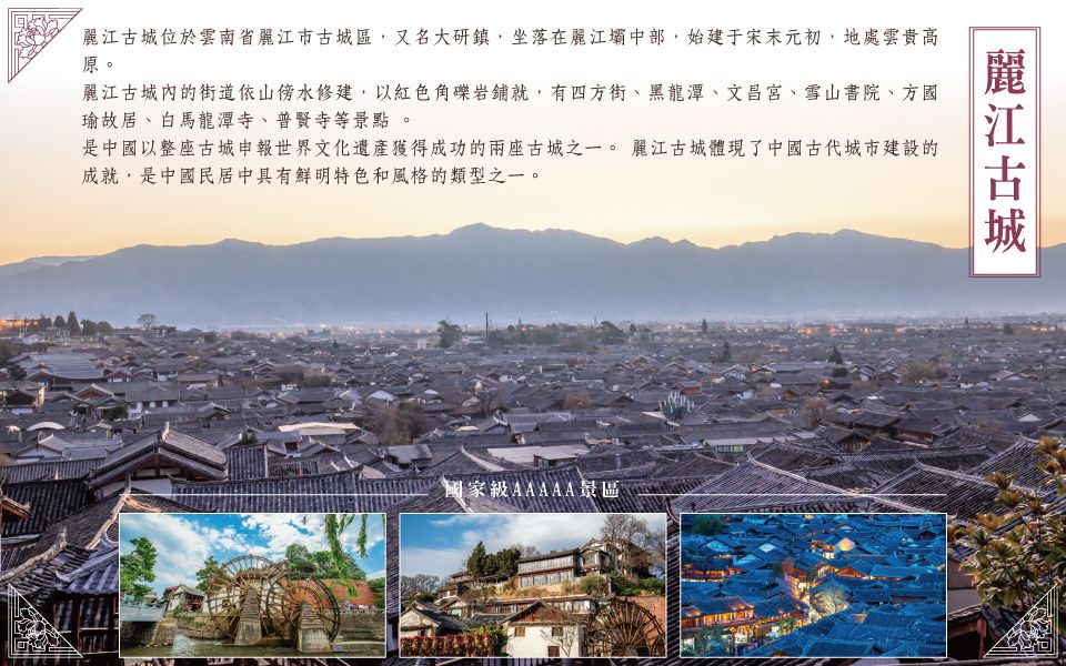 【麗江古城】位於雲南省麗江市古城區,又名大研鎮,坐落在麗江壩中部,始建于宋末元初(西元13世紀後期),地處雲貴高原,面積為7.279平方公里。麗江古城內的街道依山傍水修建,以紅色角礫岩鋪就,有四方街、木府、五鳳樓、黑龍潭、文昌宮、王丕震紀念館、雪山書院、王家莊基督教堂、方國瑜故居、白馬龍潭寺、顧彼得舊居、淨蓮寺、普賢寺 [3]、接風樓、十月文學館、紅軍長征過麗江指揮部紀念館、麗江古城歷史文化展示館、麗江古城徐霞客紀念館等景點 。麗江古城是中國以整座古城申報世界文化遺產獲得成功的兩座古城之一。 麗江古城體現了中國古代城市建設的成就,是中國民居中具有鮮明特色和風格的類型之一。