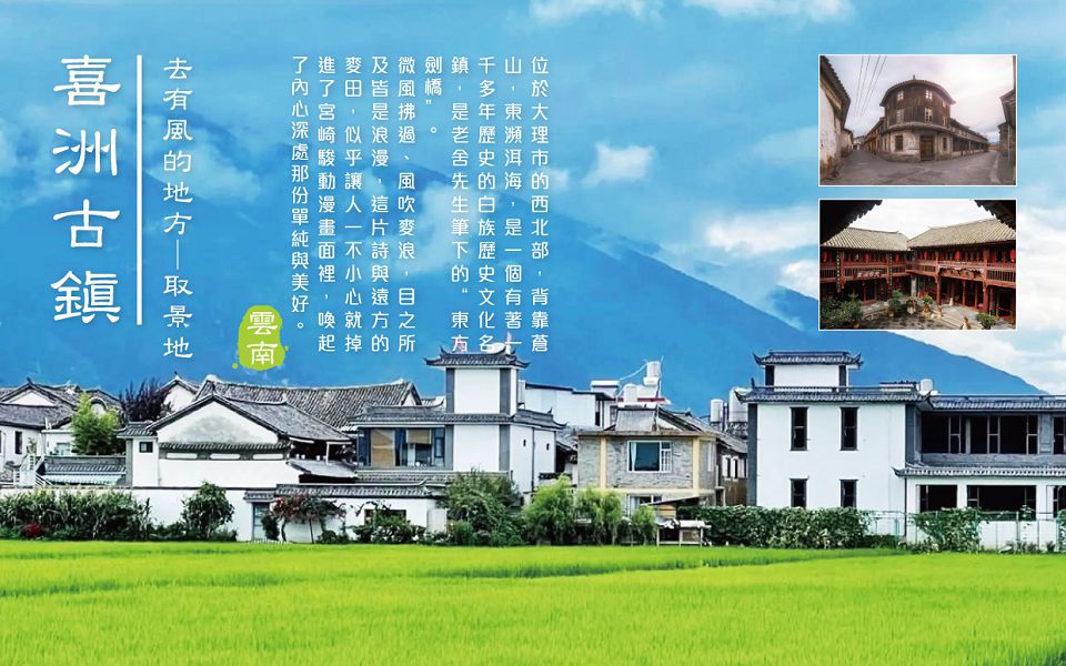 【喜洲古鎮】位於大理古城以北18公里處,東臨洱海,西枕蒼山,喜洲是重要的白族聚居的城鎮,這裡有著保存最多、最好的白族民居建築群。從佈局上看是典型的“三坊一照壁”及“四合五天井”的白族庭院格局。這些民居雕樑畫棟、斗拱重疊、翹角飛簷、門樓、照壁、山牆的彩畫裝飾藝術絢麗多姿,充分體現了白族人民的建築才華和藝術創造力。古鎮的街道都是石板鋪成,有許多保存完整的百年老院,還有金燦燦的油菜花海一望無際,隨風舞動,飄溢的油菜花香霎時間充滿整個鼻腔,讓人沉醉其中。