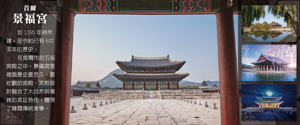 【韓服遊景福宮】是韓國五大宮闕中規模最大、建築設計最美麗的一座。景福宮中最具朝鮮時期代表性的建物就屬慶會樓與香遠亭的蓮花池,至今仍保有當時的面貌,勤政殿前的石階與石雕等,也都是當時雕刻藝術的代表。目前興禮門外西側建有國立古宮博物館,內香遠亭東側則有國立民俗博物館。換上古代傳統的禮服,您可成為最佳男女主角,於景福宮內捕捉美麗的倩影。※預計停留時間大約1小時
