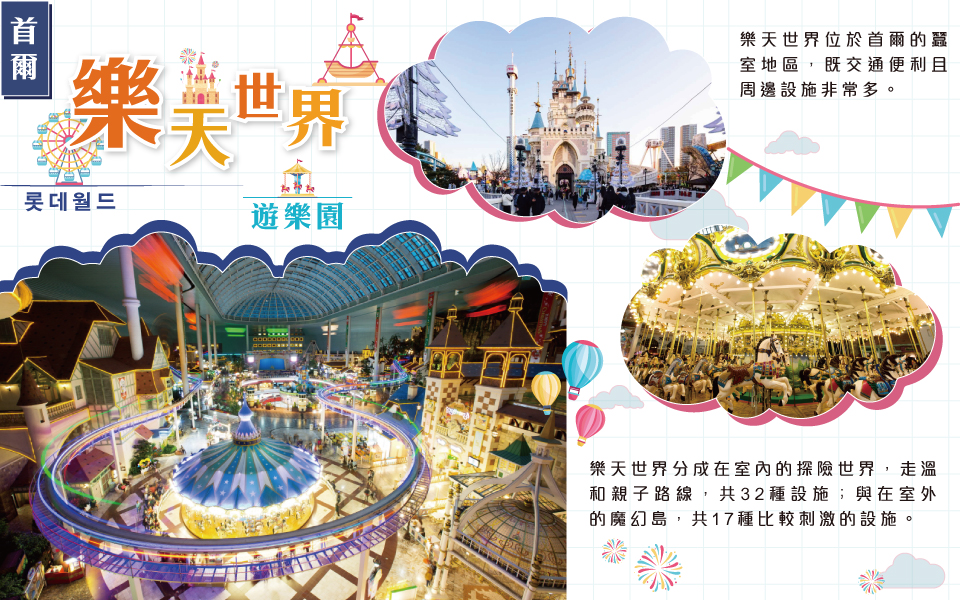 【樂天世界主題樂園】是一座集遊樂,並具有文化內涵的超大型城市休閒遊樂園,園內有劇中男女主角充滿夢幻的~旋轉木馬外,還有世界最大的室內主題公園“驚險樂天世界”,漂浮湖水中的“魔術島”,此外還設有民俗館、劇場、電影院、滑冰場等。