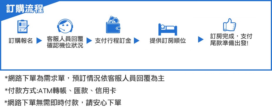 2.機位一經確認OK即需繳付全額機票款訂金,無法更改日期、取消並無法退費,並請提供正確護照英文名單以利訂房作業,待飯店OK另行通知,敬請注意。
