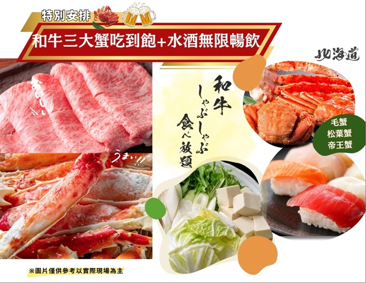 晚餐: 三大蟹+和牛涮涮鍋吃到飽+水酒無限暢飲(80分鐘)