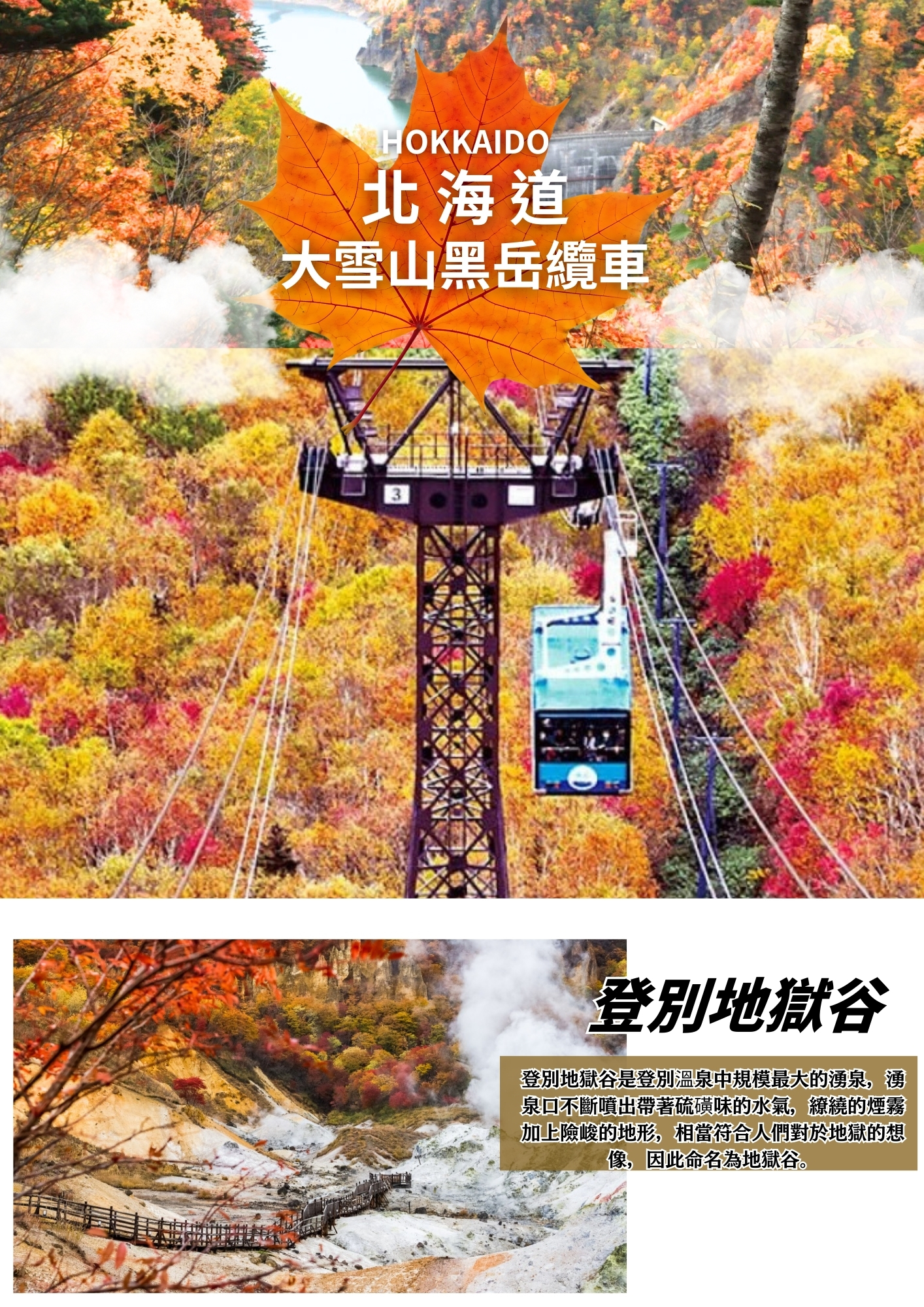 【登別地獄谷】位於登別溫泉街的東北側,是約1萬年前發生的笠山爆發所形成的噴火口,溫泉的出水量每分鐘高達3000立方公升,為登別最大的泉源,依地點不同,湧出之源泉水質亦不相同,可達11種之多。