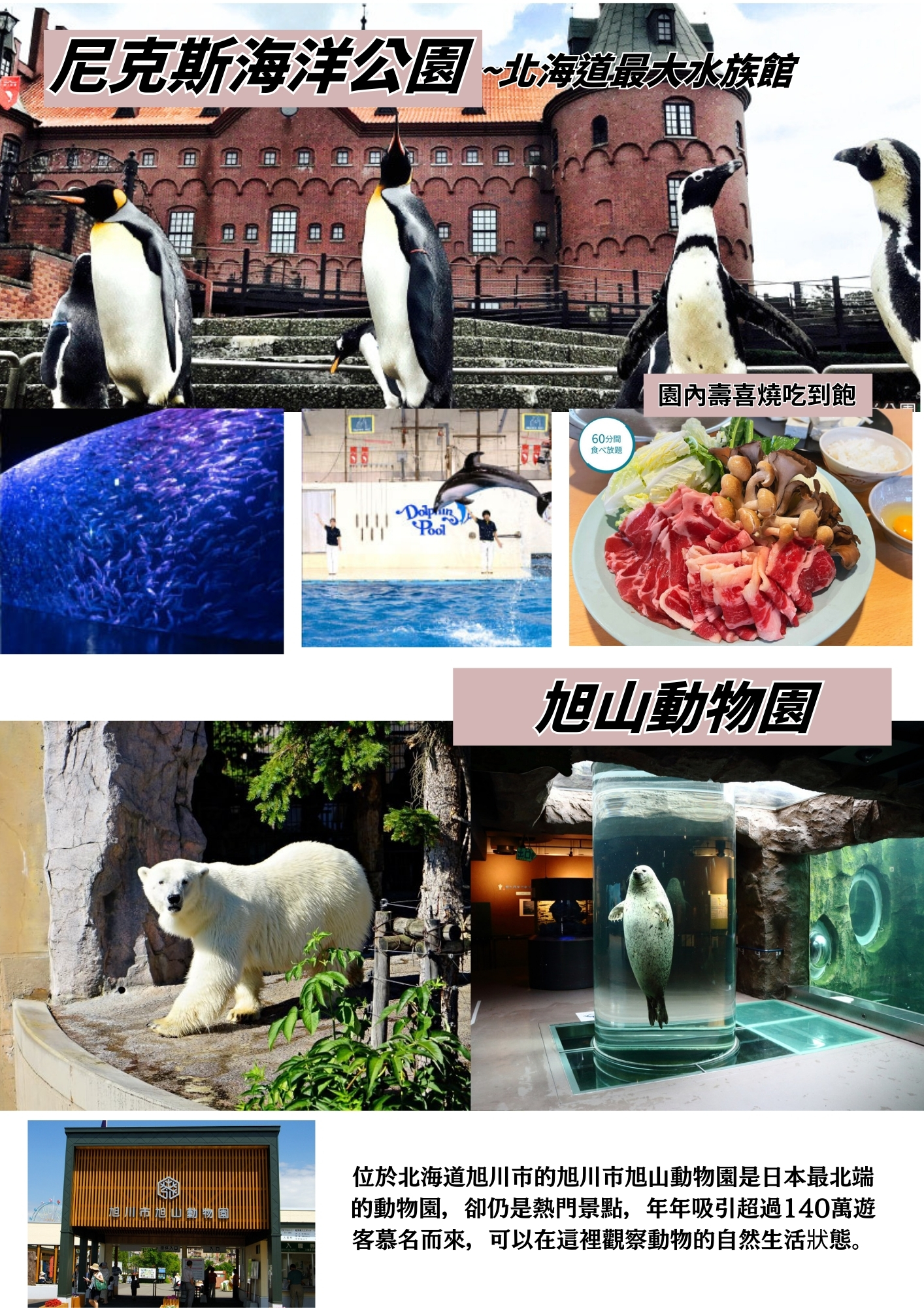 【旭山動物園】這裡率先採用「行動展示」的方式,展現出動物最自然的活動姿態,成為日本最受歡迎的 動物園。在企鵝館,可以從水中隧道觀察企鵝來回游動的姿態;在北極熊館,可以從半圓形的玻璃罩中觀 察北極熊跳水的英姿。花費心思設計的獨特遊樂設施,可以近距離觀察動物最自然的姿態,因而受到遊客 喜愛。繁殖、飼養許多寒帶動物,並且是日本第一次成功自然繁殖北極熊、金錢豹、角鴞。在海豹館,可 以從連結著水槽的圓柱型玻璃,觀察海豹游動的姿態。