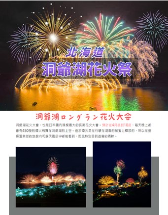 ※若因天氣問題或無法入住洞爺湖飯店,無法欣賞夜間煙火時,每人改贈一顆當季水果及一瓶飲料。