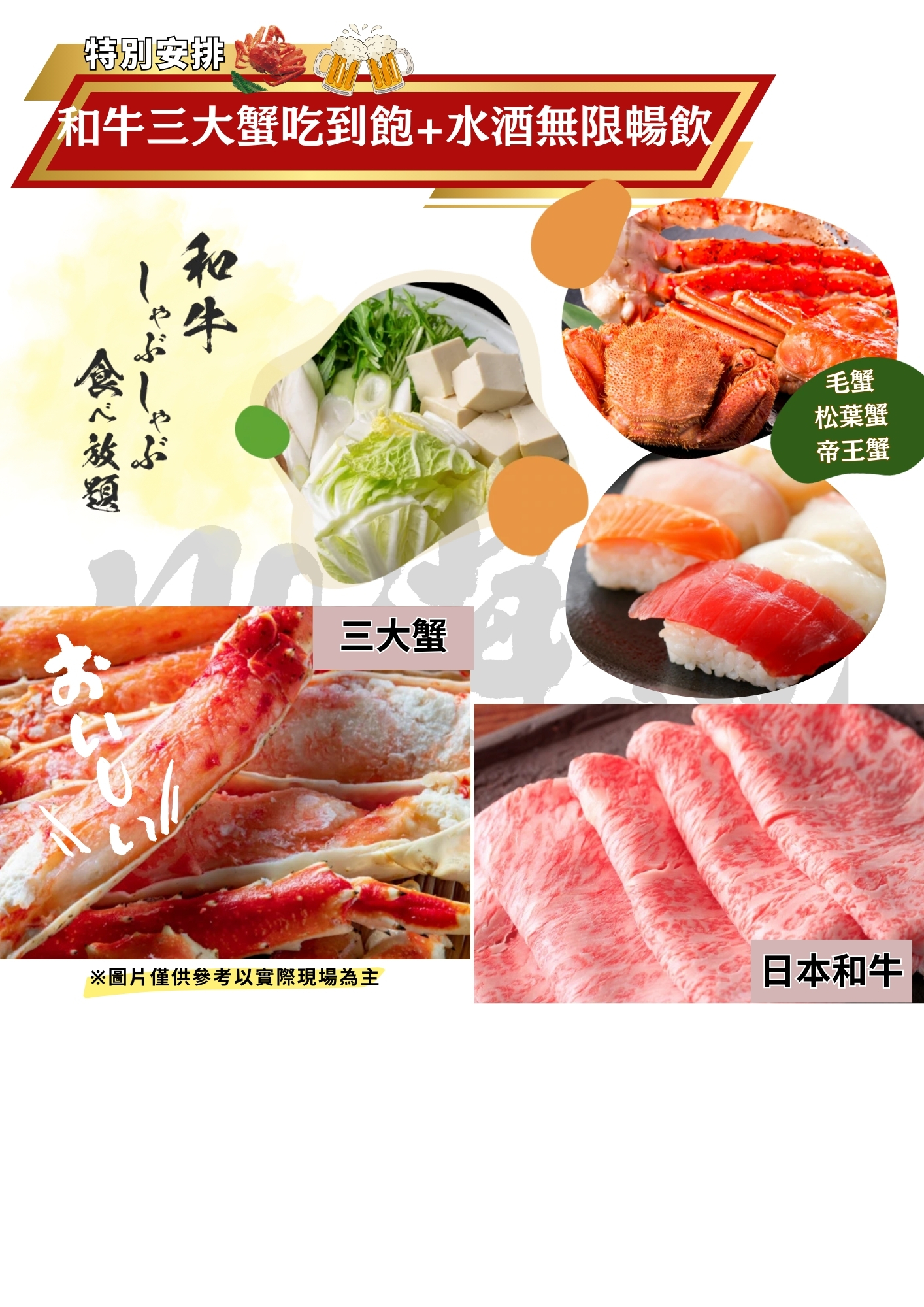 ※備註:若今晚晚餐因客滿或螃蟹缺貨不能享用三大螃蟹吃到飽,則每人退6000日幣改自理餐。