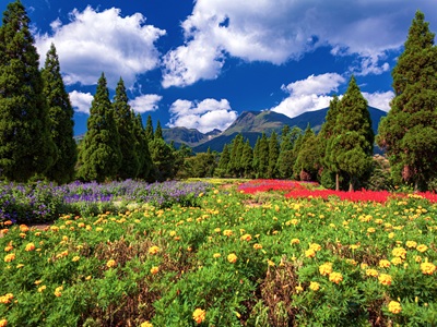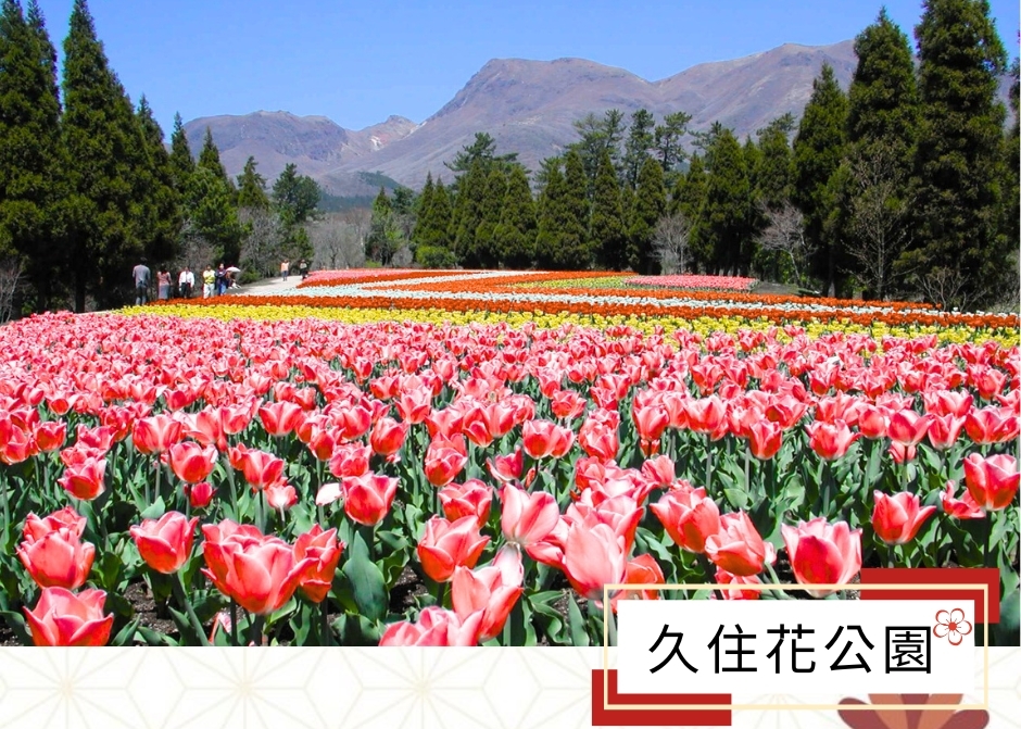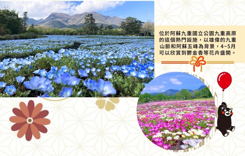 【久住花公園】大分縣竹田市九重花卉公園位於阿蘇國立公園內的九重台地。這裡是一座一年四季皆可以欣賞美麗自然風光的花卉公園,以日本百座名山之一的九重山脈和遠處的阿蘇五峰為背景,可以欣賞到500種,500萬株各色鮮花!