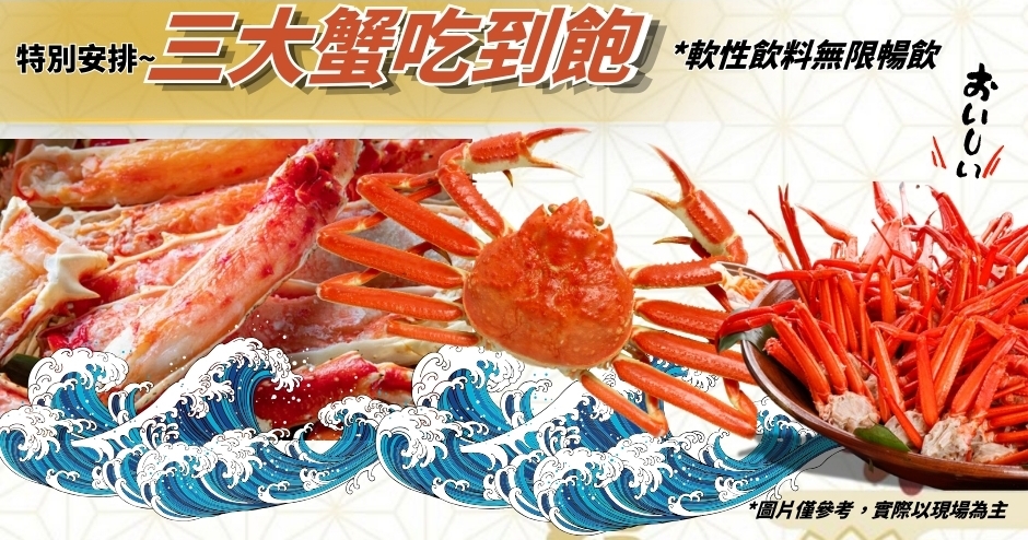 ※備註:若因三大蟹缺貨或客滿無法提供時,晚餐則改為涮涮鍋吃到飽,並退費3000日幣。敬請見諒。