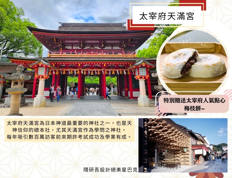 【太宰府天滿宮】是全國天滿宮本社,每逢考試期間,就擠滿了祈求考試合格的學子及家長;由於菅原道真愛梅,天滿宮園中遍植梅樹而有「飛梅傳說」之稱,梅餅、梅茶等更是當地著名特產。附近販賣的現烤的「梅餅」更是美味。還有永保終身的「飛梅御守」更是一絕。太宰府前的日式古街裡,販賣著各式各樣的日本小飾品與名產點心,絕對讓您心動不已。