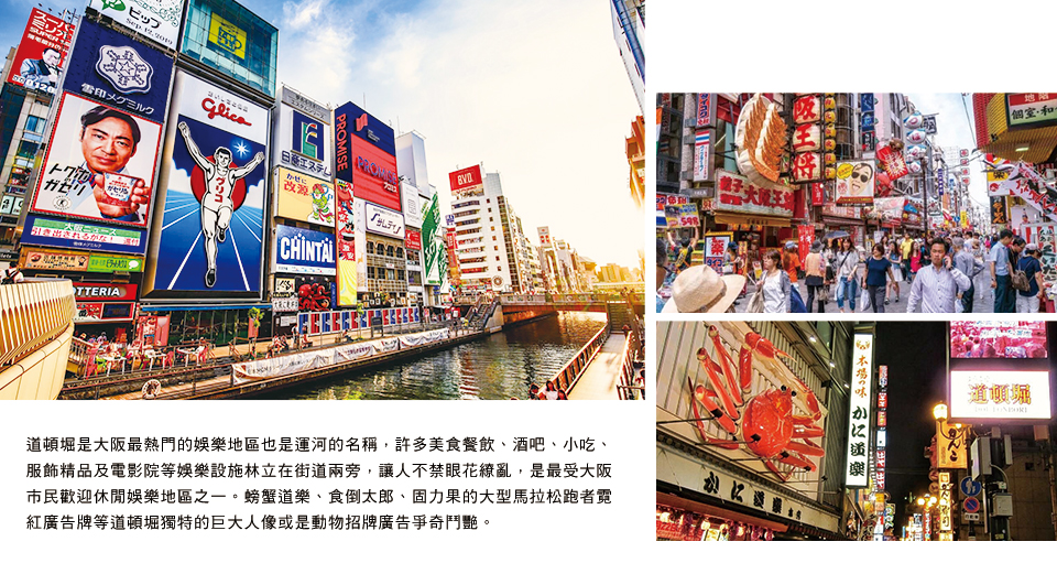 【道頓堀】大阪是遊客和狂歡者的天堂。在道頓堀,高聳的霓虹燈招牌、會所、酒吧以及供應當地特色美食的餐廳比比皆是。在這裡可以體驗到刺激而又不容錯過的大阪夜生活。道頓堀霓虹閃爍的建築牆面高高聳立,這證明了在霓虹燈作為一項極具前景的全新技術而佔據主導地位的時代,日本人所擁有的樂觀開朗的精神。整個地區都流露出這種濃郁的復古未來主義風格,對於想要領略典型的日本大都市氛圍的遊客,這裡可謂是不二之選。